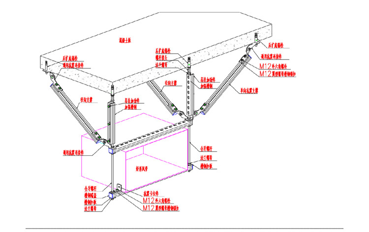 管道抗震支架一般分為側(cè)向抗震支吊架和側(cè)縱向抗震支吊架。一般采用膨脹錨栓、全螺紋螺桿、連接構(gòu)件、角鋼或C型槽鋼和U型管夾,支吊架間距可根據(jù)實際情況調(diào)整,不大于規(guī)定的安裝間距。